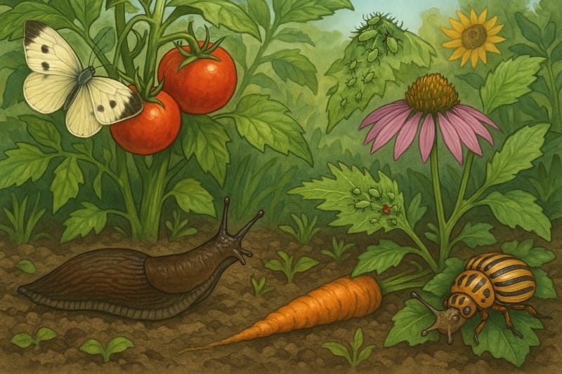 Slugs and snails are perhaps the most well-known enemies of August gardens. Attracted to tender leaves and seedlings, they come out at night or after rain and leave behind a trail of slime and chewed foliage. Their damage is most visible in hostas, lettuces, dahlias, and young seedlings.